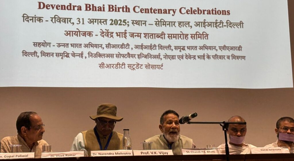 उक्त उद्गार सर्वोदय आंदोलन में संलग्न, चिपको आंदोलन के प्रणेता, ख्यातनाम पर्यावरणविद् पद्मविभूषण चंडीप्रसाद भट्ट ने व्यक्त किया। वे आईआईटी दिल्ली के सभागार में ग्रामीण प्रौद्योगिकी के पुरोधा देवेंद्र कुमार गुप्ता की जन्मशताब्दी वर्ष समारोह के मुख्य वक्ता के रूप में बोल रहे थे। इस मौके पर जैन मुनि डॉ. अभिजीत कुमार, मुनि जाग्रति कुमार, आईआईटी दिल्ली के सीआरडीटी के डॉ. वी.के; विजय, आईआईटी, मुंबई के निदेशक डॉ. शिरीष केदारे, देंवेंद्र भाई के सुपुत्री डॉ. विभा गुप्ता, पुत्र राजीव गुप्ता विशेष वक्ता के तौर पर उपस्थित थे।