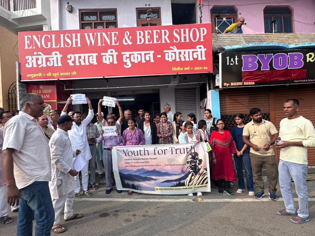 देशभर से आए यूथ फॉर ट्रुथ के युवा सदस्यों, गांधी चिंतकों, वरिष्ठजनों, महिलाओं और सामाजिक कार्यकर्ताओं ने कौसानी में शराब की दुकान के खिलाफ एकजुट होकर विरोध प्रदर्शन किया। प्रदर्शनकारियों ने पंत मार्ग से कौसानी तिराहे तक पदयात्रा निकाली और शराब की दुकान के सामने अपना रोष जताया।