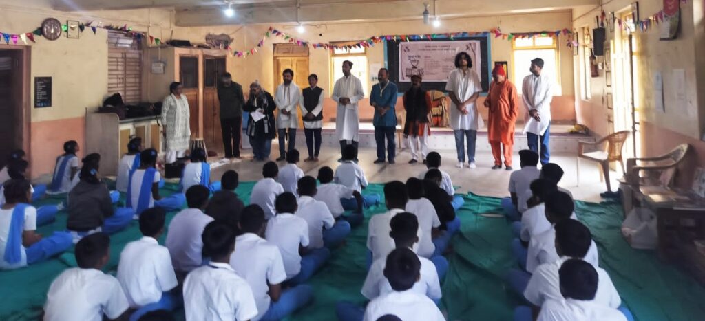 मैं यहाँ पिछली यात्रा के दौरान भी आया था इसलिए योगेश भाई को मैं याद भी था। उन्होंने कहा, हमारे यहाँ परीक्षाएँ शुरू हो रही हैं लेकिन चूँकि हमें राधिका बहन ने बताया कि विनीत भाई इप्टा की टीम के साथ आ रहे हैं तो हमने एक घंटे का समय आपके लिए निकाल लिया है। तो सूत की माला का संक्षिप्त स्वागत स्वीकार कर बिना समय नष्ट किए हमने एक घंटे में नाटक का मंचन किया और जनगीतों की प्रस्तुति दी। स्कूली बच्चों को देखकर सारिका ने तुरंत ही सफ़दर हाशमी की कविता ‘ये कैसा है घोटाला’ का साभिनय पाठ प्रस्तुत किया। बच्चों को सभी कार्यक्रम बहुत पसंद आए।
