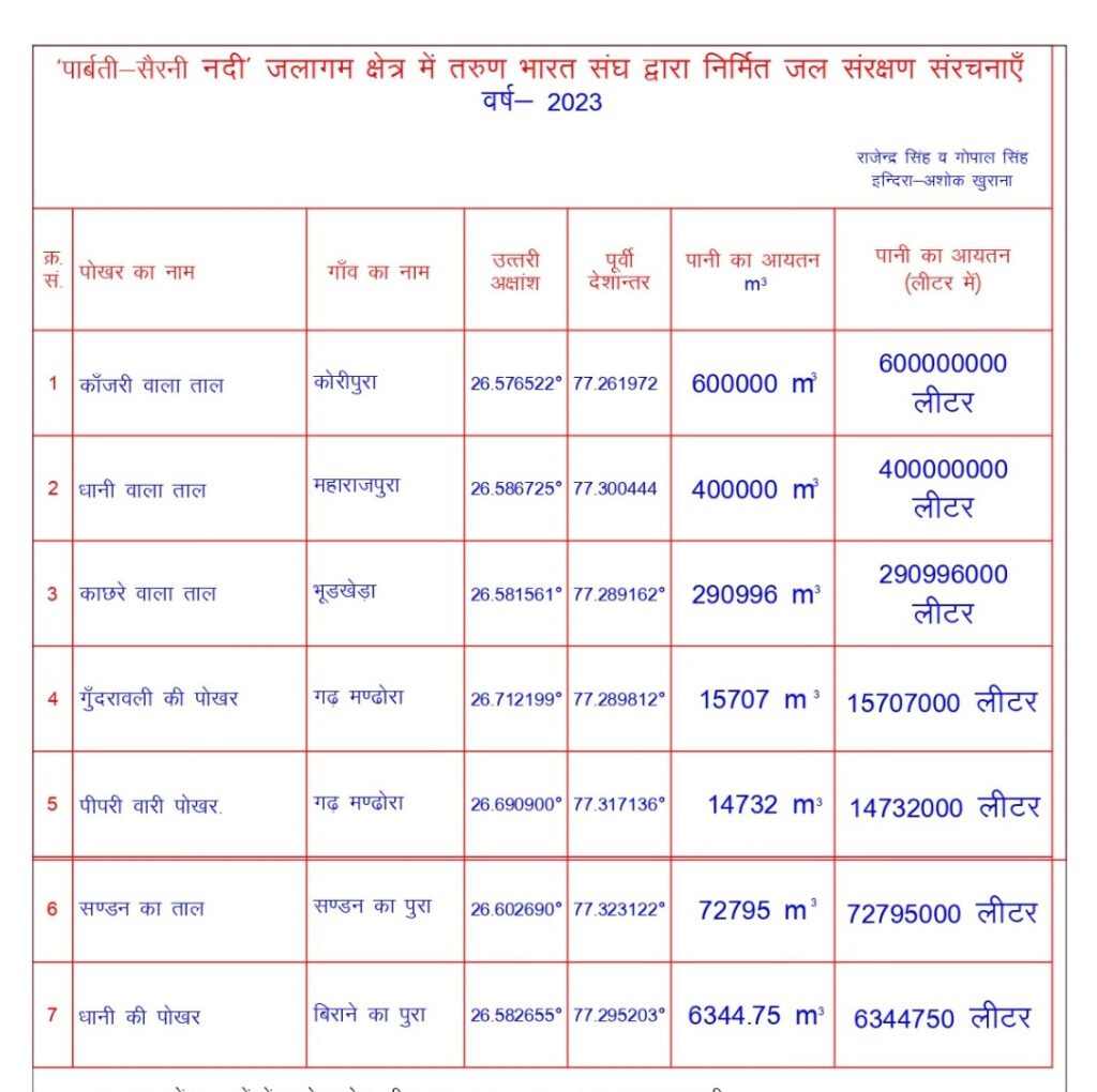 तरुण भारत संघ द्वारा बनाए गए पोखर, तालाब देखें, तो पीपर वाली पोखर, गढ़मण्डोरा उसकी क्षमता एक करोड़़ सैतालीस लाख बत्तीस हजार है। यह सबसे छोटी मानी जा सकती है। इससे थोड़ा बड़ा संडन वाला ताल, फैदालपुरा है, जिसकी क्षमता 7 करोड़ 27 लाख 95 हजार लीटर है। कोरीपुरा की 60 करोड़ लीटर के आसपास है। भूडखेड़ा की 29 करोड़ लीटर, महाराजपुरा की लगभग 40 करोड़ लीटर है। इस तरह से हमारे पास 7 तरह की जल संरचनाएँ है। पहली जिनकी 60 करोड़ लीटर से ज्यादा क्षमता है, दूसरी 40 करोड लीटर वाली, तीसरी 30 करोड़, चौथी 1.57 करोड, पांचवीं 1.47 करोड, छटवीं 7.27 करोड और सातवीं 0.63 करोड़ लीटर है।