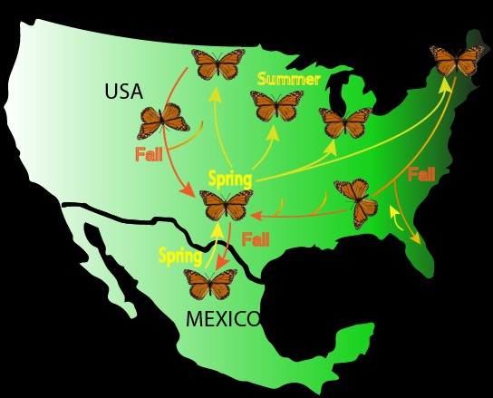 ज्ञात कीट प्रजातियों में उत्तरी अमेरिका की मोनार्क तितलियां सबसे लंबा प्रवास करती हैं। मध्य मेक्सिको में जाड़ा बिताने के बाद ये तितलियां उत्तर की ओर प्रवास करती हैं। हज़ारों किलोमीटर लंबे सफर में ये कई पीढ़ियां पैदा करती हैं। दक्षिणी कनाडा पहुंचने वाली संतानें गर्मियों के अंत में वापस मैक्सिको की यात्रा शुरू कर देती हैं।