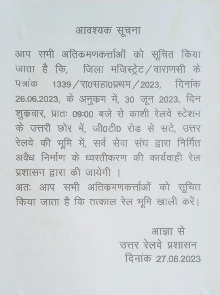 आज मंगलवार को अचानक रेलवे सुरक्षा बल की एक टुकड़ी की तरफ से परिसर स्थित सर्व सेवा संघ के सभी भवनों पर यह नोटिस चस्पा की गयी है। नोटिस के मुताबिक 30 जून से पहले यह जमीन खाली करने का निर्देश दिया गया है। प्रकाशन और परिसर के कार्यकर्ताओं तथा निवासियों को ‘अतिक्रमणकारी’ कहकर संबोधित किया गया है।