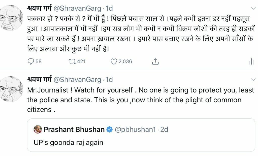 विक्रम जोशी की हत्या को लेकर मैंने एक ट्वीट किया था । उसकी प्रतिक्रिया में सैंकड़ों लोग मेरे द्वारा व्यक्त चिंता के समर्थन में आ गए।पर कुछ उनसे अलग भी थे जिनके विचारों का उल्लेख यहाँ इसलिए ज़रूरी है कि देश किस तरह से चलना चाहिए ये ही लोग तय करते हैं।जैसे :(1)’ सही कह रहे हैं श्रीमानजी ! अधिकांश मीडिया जगत के पास साँसों के अलावा कुछ भी नहीं बचा। कलम तो पहले ही बिक चुकी है ,अब साँसों का भी संकट खड़ा हो गया है ‘, (2)’पिछली सरकार में तो पत्रकारों को जेड प्लस सुरक्षा थी। कोई भी पत्रकार की हत्या नहीं हुई ,लिस्ट भेजूँ क्या ?’, (3) ‘विक्रम जोशी की हत्या उनके द्वारा पत्रकार की हैसियत से किसी रिपोर्ट के प्रकाशन के कारण नहीं हुई है।’ ऐसे और भी कई ट्वीट।